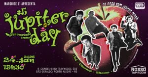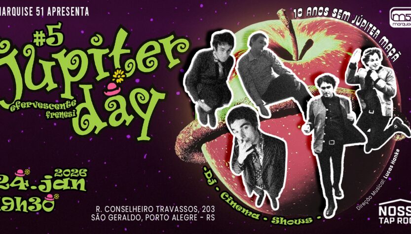 Júpiter Day | Efervescente Frenesi é o evento anual que celebra a obra do Júpiter Maçã. O evento ocorre sempre em janeiro, mês de aniversário do artista. Júpiter não era só um artista, mas sim um estado alterado de consciência artística e inovadora. Um cometa de carne e verbo, um beat tropical misturando Kerouac, Beatles, Stones, Os Mutantes, lisergia, amor barato, deboche. Sua obra é um manifesto invisível, um evangelho para os desajustados, os notívagos, os românticos sem mapa. Júpiter é gênio, já dizia Lobão no Programa Código MTV.
