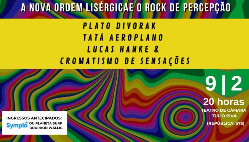 A Nova Ordem Lisérgica e O Rock de Percepção acontece dia 09 de Março de 2026 com um encontro explosivo e brilhante no projeto clássico, a Segunda Maluca que ocorre no novíssimo Teatro Túlio Piva em Porto Alegre: O lendário Plato Divorak, O doce andarilho Tatá Aeroplano e o Príncipe da Psicodelia Lucas Hanke & O Cromatismo de Sensações apresentam seus shows numa noite inédita e imperdível.